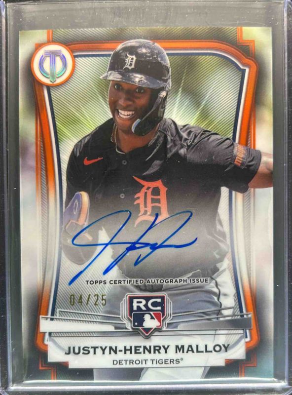The Justyn-Henry Malloy 2025 Topps Tribute #LIA-JM League Inauguration Autograph - Orange /25 Rookie card is 1 of 26 Justyn-Henry Malloy's card variations in the 2025 Topps Tribute set being tracked by Sports Card Investor, including Base, Blue /150, Green /99, Gold /75, and Purple /50.