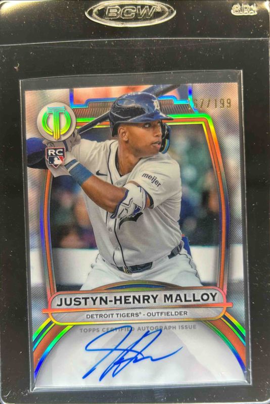 The Justyn-Henry Malloy 2025 Topps Tribute #TA-JM Tribute Autograph /199 Rookie card is 1 of 26 Justyn-Henry Malloy's card variations in the 2025 Topps Tribute set being tracked by Sports Card Investor, including Base, Blue /150, Green /99, Gold /75, and Purple /50.