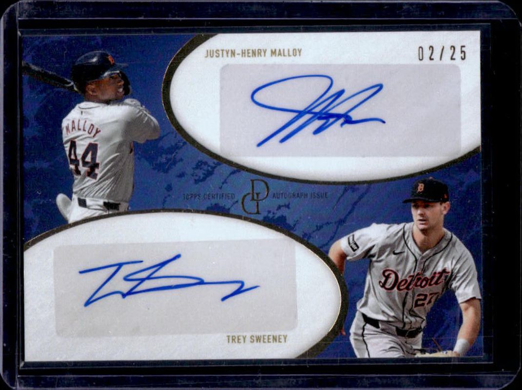 The Justyn-Henry Malloy / Trey Sweeney 2025 Topps Dynamic Duals #27D Dual Autographs - Blue /25 card is 1 of 15 Justyn-Henry Malloy / Trey Sweeney's card variations in the 2025 Topps Dynamic Duals set being tracked by Sports Card Investor, including Base, Purple /99, Black /50, Blue /25, and Red /10.