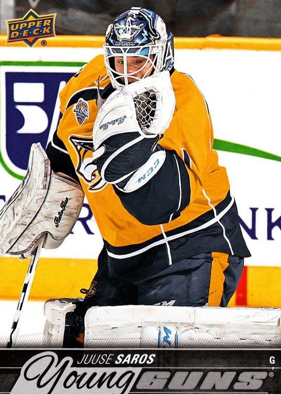 This card is 1 of 8 Juuse Saros' card variations in the 2015 Upper Deck set being tracked by Sports Card Investor, including Young Guns Base, Young Guns Canvas, Young Guns - Acetate, Young Guns - Foil, and Young Guns - UD Exclusives /100.