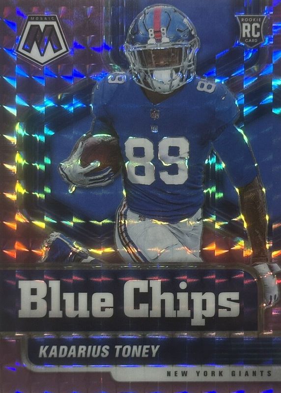 The Kadarius Toney 2021 Mosaic #11 Blue Chips - Purple /49 Rookie card in Raw condition has not changed in price in the last 30 days and was last sold for $3.00 .