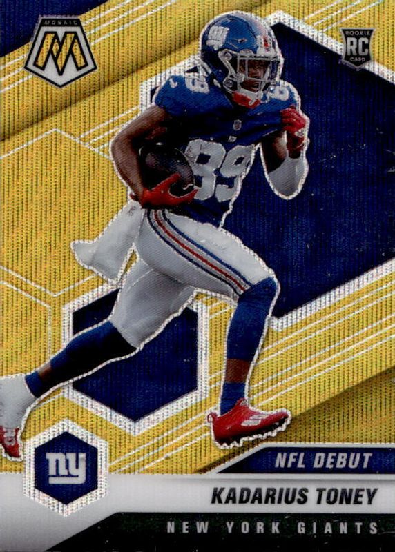 The Kadarius Toney 2021 Mosaic #251 NFL Debut - Gold Wave /17 Rookie card in Raw condition has not changed in price in the last 30 days and was last sold for $22.50 .