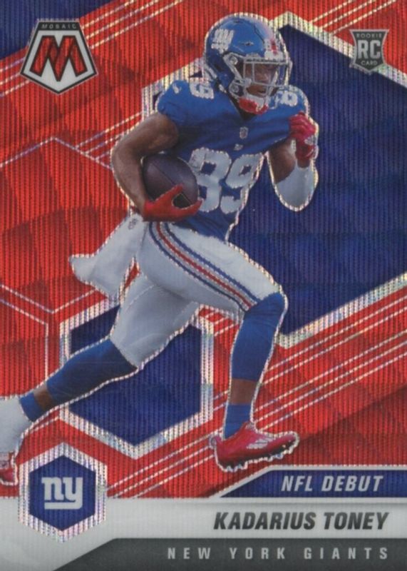 The Kadarius Toney 2021 Mosaic #251 NFL Debut - Red Wave /9 Rookie card in Raw condition has not changed in price in the last 30 days and was last sold for $61.00 .