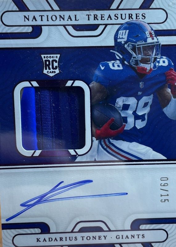 This card is 1 of 44 Kadarius Toney's card variations in the 2021 National Treasures set being tracked by Sports Card Investor, including Rookie Patch Auto /99, Rookie Patch Auto - Green Jersey Number (/89), Rookie Patch Auto - Purple /49, Rookie Patch Auto - Holo Silver /25, and Rookie Patch Auto - Stars & Stripes Holo Silver /25.