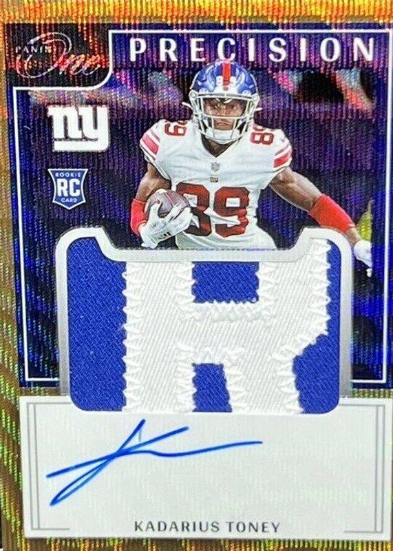 This card is 1 of 14 Kadarius Toney's card variations in the 2021 One set being tracked by Sports Card Investor, including Precision Rookie Patch Autographs (/49), Precision Rookie Patch Autographs - Blue (/35), Precision Rookie Patch Autographs - Bronze (/25), Precision Rookie Patch Autographs - Red (/20), and Rookie Patch Auto (/99).