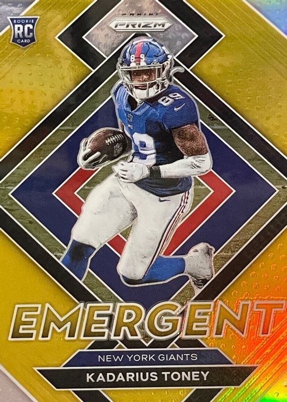 The Kadarius Toney 2021 Prizm #E-12 Emergent - Gold /10 Rookie card in Raw condition has not changed in price in the last 30 days and was last sold for $39.00 .