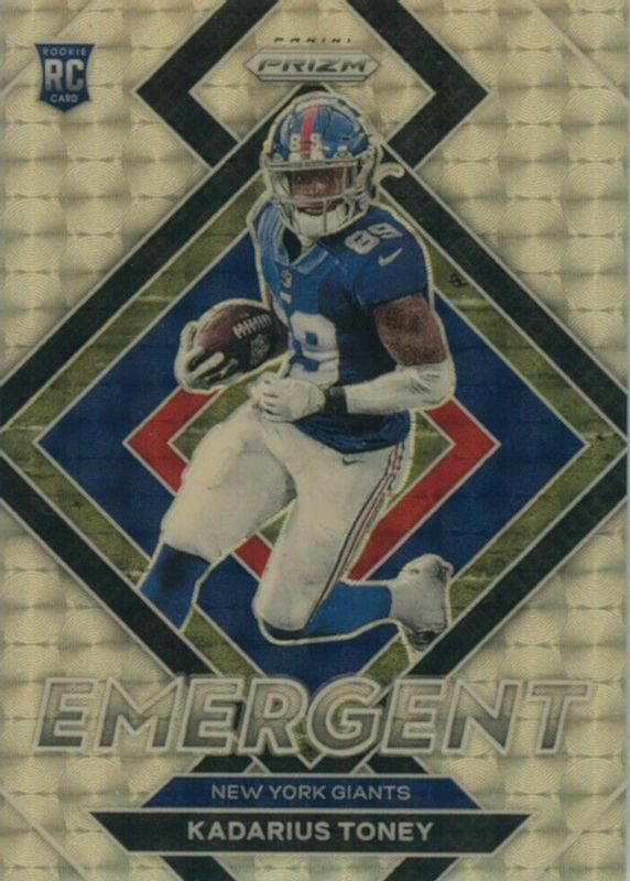The Kadarius Toney 2021 Prizm #E-12 Emergent - Gold Vinyl /5 Rookie card in Raw condition has not changed in price in the last 30 days and was last sold for $33.00 .