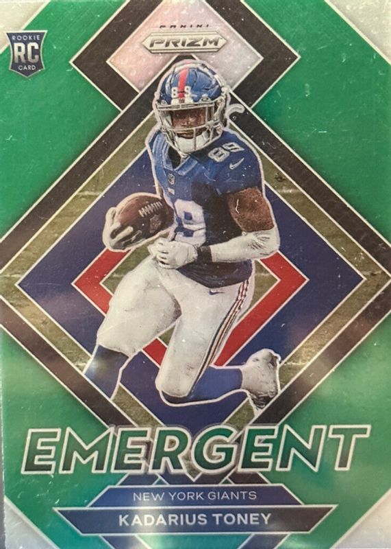 The Kadarius Toney 2021 Prizm #E-12 Emergent - Green Rookie card in Raw condition has not changed in price in the last 30 days and was last sold for $5.51 .