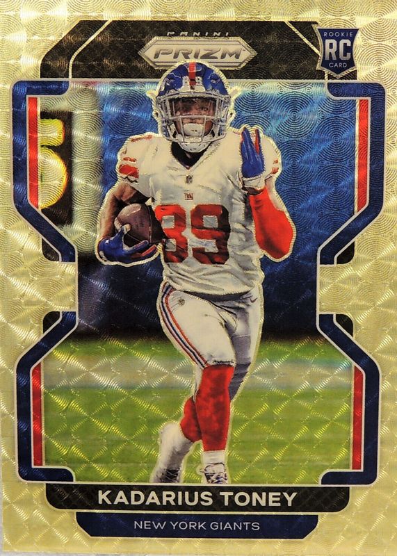 The Kadarius Toney 2021 Prizm #342 Gold Vinyl /5 Rookie card in Raw condition has not changed in price in the last 30 days and was last sold for $214.50 .