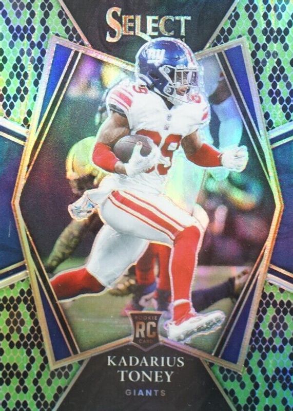 The Kadarius Toney 2021 Select #152 Premier Level Green & Black Snakeskin /2 Rookie card in Raw condition has not changed in price in the last 30 days and was last sold for $13.50 .