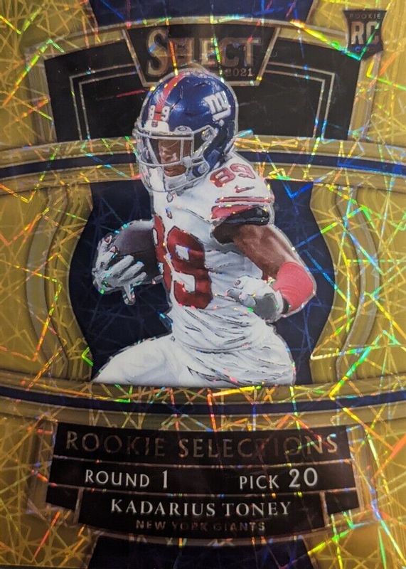 The Kadarius Toney 2021 Select #RS-12 Rookie Selections - Gold /10 card in Raw condition has not changed in price in the last 30 days and was last sold for $9.99 .