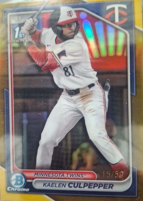 The Kaelen Culpepper 2024 Bowman Draft #BDC-98 Chrome - Gold Refractor /50 (1st) card in Raw condition has not changed in price in the last 30 days and was last sold for $35.00 .