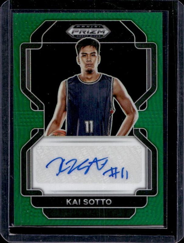 The Kai Sotto 2022 Prizm Draft Picks #DP-KSO Draft Picks Autographs - Green Rookie card is 1 of 22 Kai Sotto's card variations in the 2022 Prizm Draft Picks set being tracked by Sports Card Investor, including Draft Picks Autographs, Draft Picks Autographs - Hyper, Draft Picks Autographs - Silver, Draft Picks Autographs - Red /199, and Draft Picks Autographs - Blue /149.