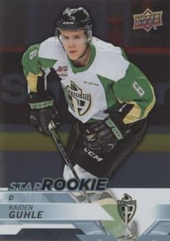 The Kaiden Guhle 2018 Upper Deck CHL #336 Silver card is 1 of 9 Kaiden Guhle's card variations in the 2018 Upper Deck CHL set being tracked by Sports Card Investor, including Base, Star Rookies UD Exclusives /100, Star Rookies Midnight /25, Star Rookies High Gloss /10, and Printing Plates Black /1.