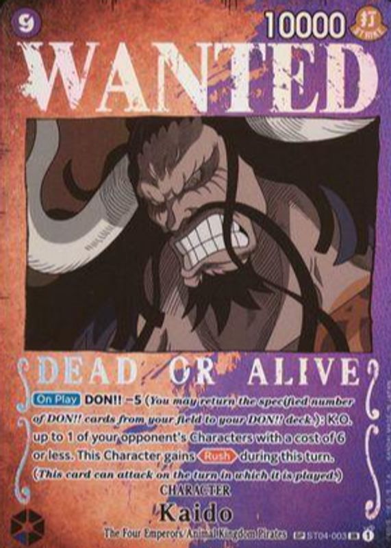 The Kaido 2023 Pillars of Strength #ST04-003 Super Rare (Wanted) card in Raw TCG (Near Mint) condition has moved down -$23.31 (-21.2%) in the last 30 days and was last sold for $86.69 .