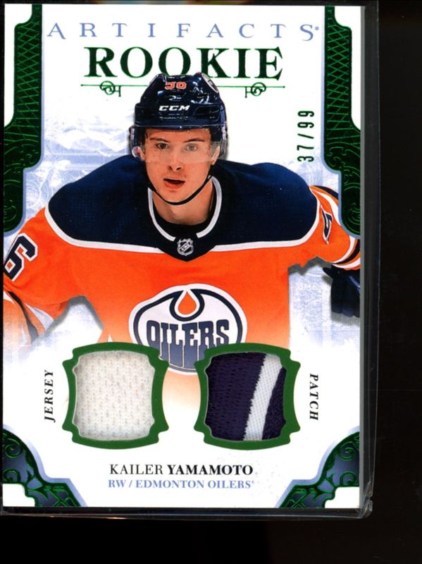 The Kailer Yamamoto 2017 Upper Deck Artifacts #IV Rookie Relics: - Emerald /99 card is 1 of 11 Kailer Yamamoto's card variations in the 2017 Upper Deck Artifacts set being tracked by Sports Card Investor, including Base /799, Rookie Auto Relics - Black, Rookie Auto Relics - Emerald, Rookie Auto Relics - Gold, and Rookie Relics: - Black.