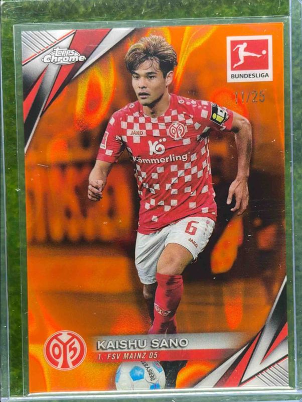 The Kaishu Sano 2024 Topps Chrome Bundesliga #69 Orange Lava Refractor /25 card is 1 of 41 Kaishu Sano's card variations in the 2024 Topps Chrome Bundesliga set being tracked by Sports Card Investor, including Base, Pulsar Refractor, Refractor, Neon Green Lava Refractor /250, and Neon Green Refractor /250.
