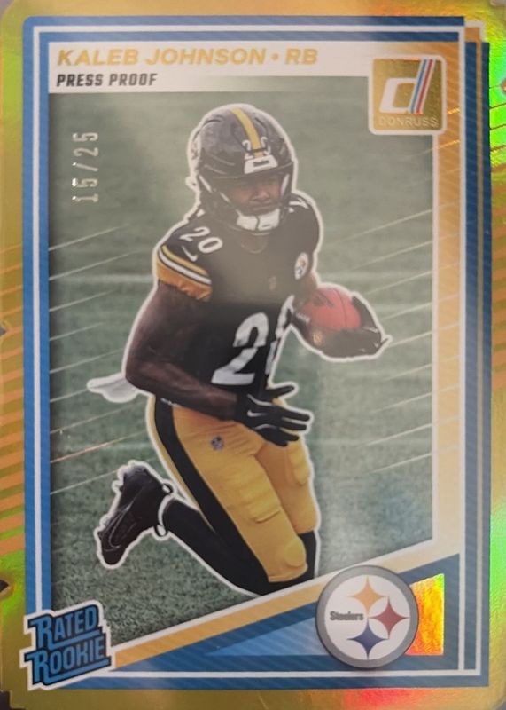 The Kaleb Johnson 2025 Donruss #322 Press Proof Gold Die-Cut /25 Rookie card in Raw condition has not changed in price in the last 30 days and was last sold for $12.50 .