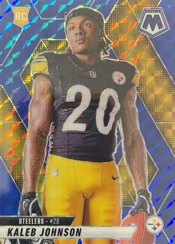 The Kaleb Johnson 2025 Mosaic #289 Rookie Variation - Blue /99 card in Raw condition has not changed in price in the last 30 days and was last sold for $0.99 .