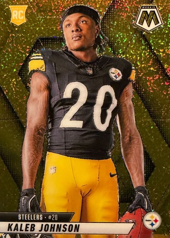 The Kaleb Johnson 2025 Mosaic #289 Rookie Variation - Gold Glitter /5 card in Raw condition has not changed in price in the last 30 days and was last sold for $56.00 .