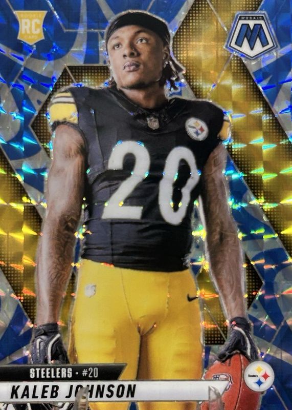 The Kaleb Johnson 2025 Mosaic #289 Rookie Variation - Reactive Blue card in Raw condition has moved up $0.26 (+26.3%) in the last 30 days and was last sold for $1.25 .