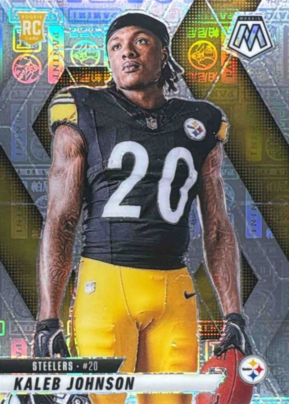 The Kaleb Johnson 2025 Mosaic #289 Rookie Variation - Silver Knight /149 card in Raw condition has moved up $8.19 (+455%) in the last 30 days and was last sold for $9.99 .