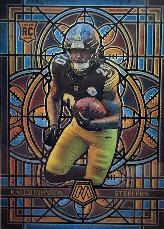 The Kaleb Johnson 2025 Mosaic #21 Stained Glass /(SSP) Rookie card in Raw condition has moved down -$20.50 (-34.2%) in the last 30 days and was last sold for $39.50 .