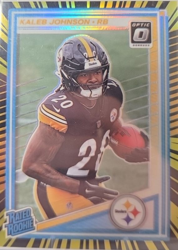 This card is 1 of 70 Kaleb Johnson's card variations in the 2025 Optic set being tracked by Sports Card Investor, including Base, Blue Hyper, Blue Scope, Green Hyper, and Green Velocity.
