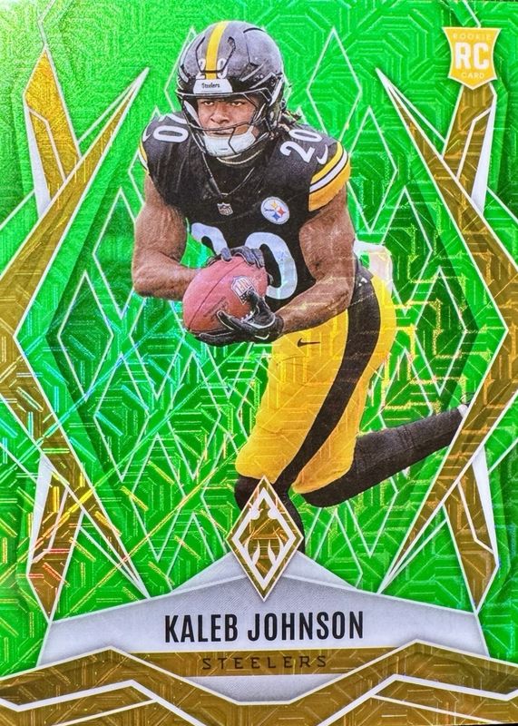 The Kaleb Johnson 2025 Phoenix #182 Lime Green Mojo /75 Rookie card in Raw condition has not changed in price in the last 30 days and was last sold for $4.50 .