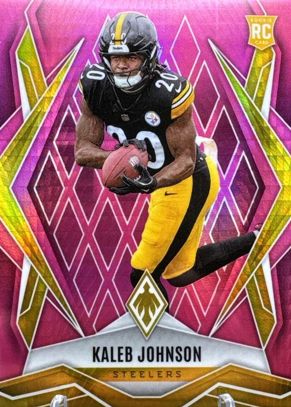 The Kaleb Johnson 2025 Phoenix #182 Pink Hyper /299 Rookie card in Raw condition has not changed in price in the last 30 days and was last sold for $0.99 .