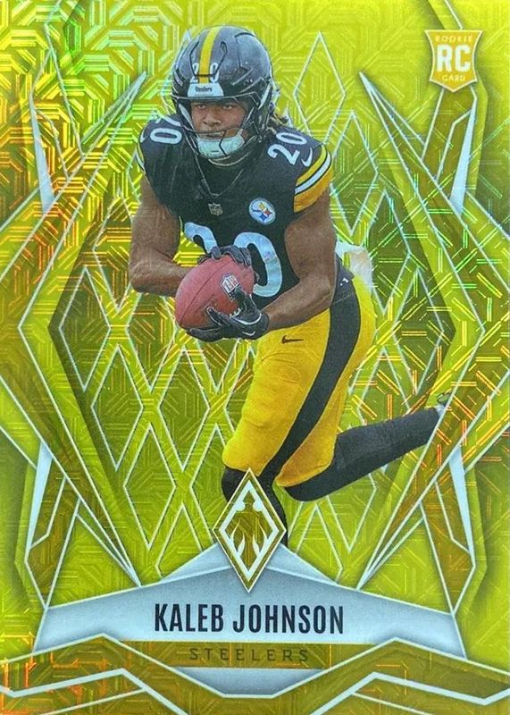 The Kaleb Johnson 2025 Phoenix #182 Yellow Mojo /35 Rookie card in Raw condition has not changed in price in the last 30 days and was last sold for $8.99 .