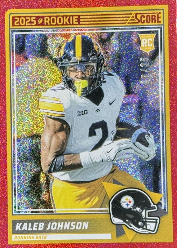 The Kaleb Johnson 2025 Score #12 Dots Red /25 Rookie card in Raw condition has not changed in price in the last 30 days and was last sold for $39.99 .
