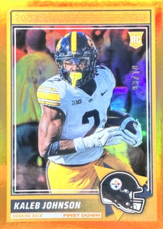The Kaleb Johnson 2025 Score #12 First Down /10 Rookie card in Raw condition has not changed in price in the last 30 days and was last sold for $65.00 .