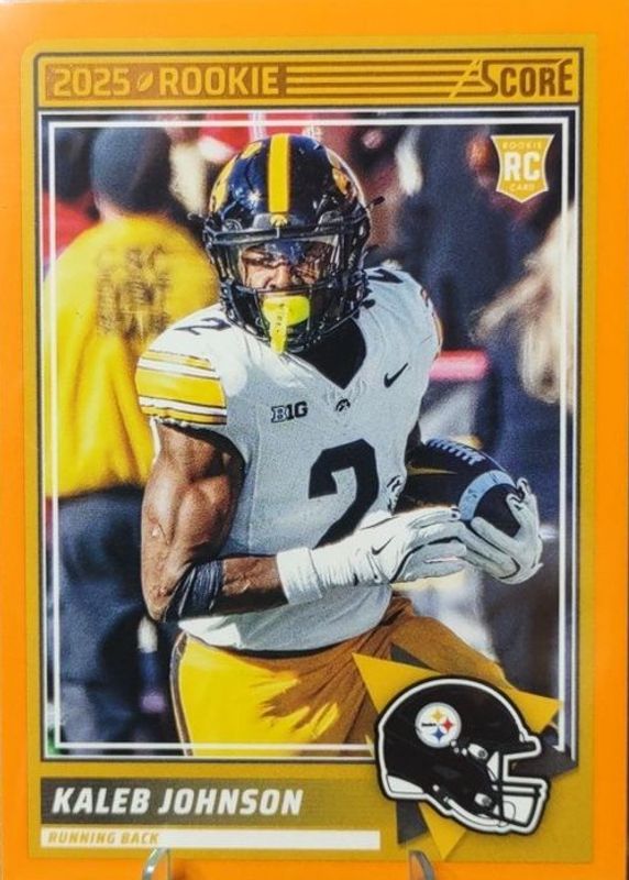 The Kaleb Johnson 2025 Score #12 Orange Rookie card in Raw condition has not changed in price in the last 30 days and was last sold for $0.99 .