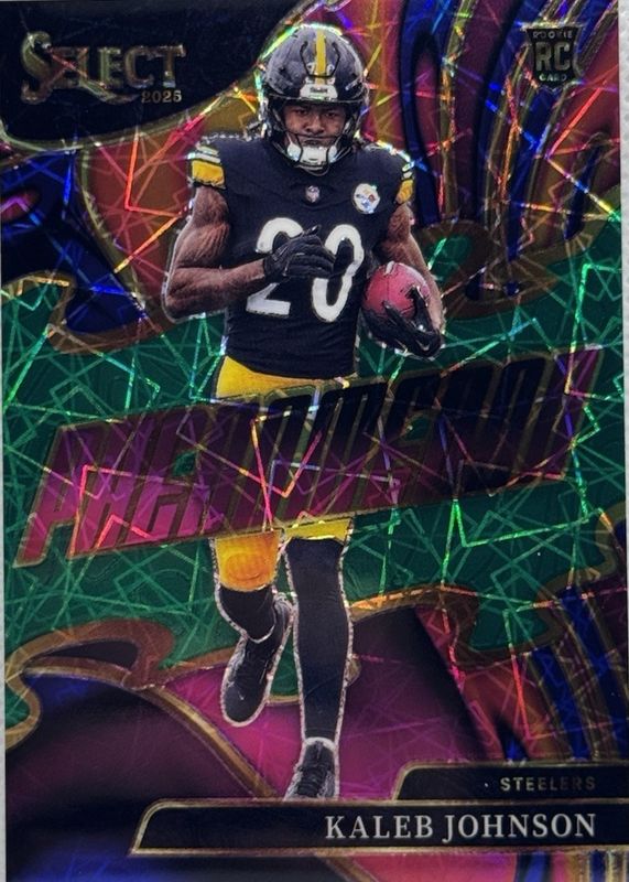 The Kaleb Johnson 2025 Select #23 Phenomenon - Green /5 Rookie card in Raw condition has not changed in price in the last 30 days and was last sold for $31.00 .