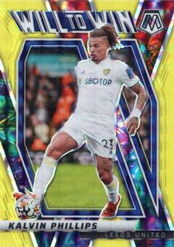 The Kalvin Phillips 2021 Mosaic Premier League #20 Will to Win - Gold Fluorescent /10 card is 1 of 39 Kalvin Phillips' card variations in the 2021 Mosaic Premier League set being tracked by Sports Card Investor, including Base, Blue Pulsar, Choice Peacock, Choice Red & Green, and Genesis.
