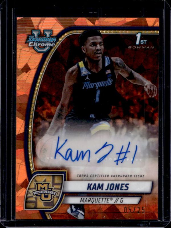 The Kam Jones 2024 Bowman Chrome University Sapphire Edition #39 Prospect Autographs - Orange Refractor /25 card is 1 of 18 Kam Jones' card variations in the 2024 Bowman Chrome University Sapphire Edition set being tracked by Sports Card Investor, including Base, Purple Refractor /100, Yellow Refractor /75, Green Refractor /65, and Gold Refractor /50.