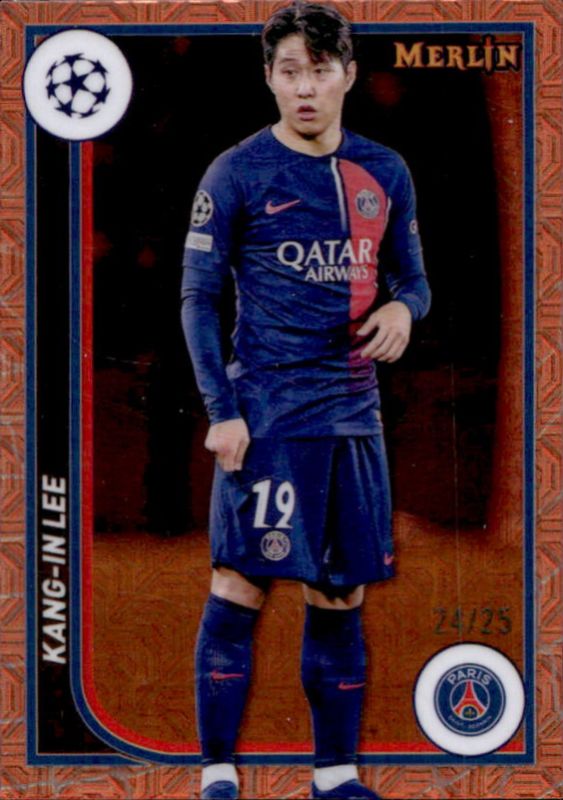 The Kang-In Lee 2023 Topps Merlin Chrome UEFA Club Competitions #90 Orange Mojo Refractor /25 card is 1 of 25 Kang-In Lee's card variations in the 2023 Topps Merlin Chrome UEFA Club Competitions set being tracked by Sports Card Investor, including Base, Aqua Prism Refractor, Refractor, Vintage Merlin Refractor, and Neon Green Shimmer Refractor /399.