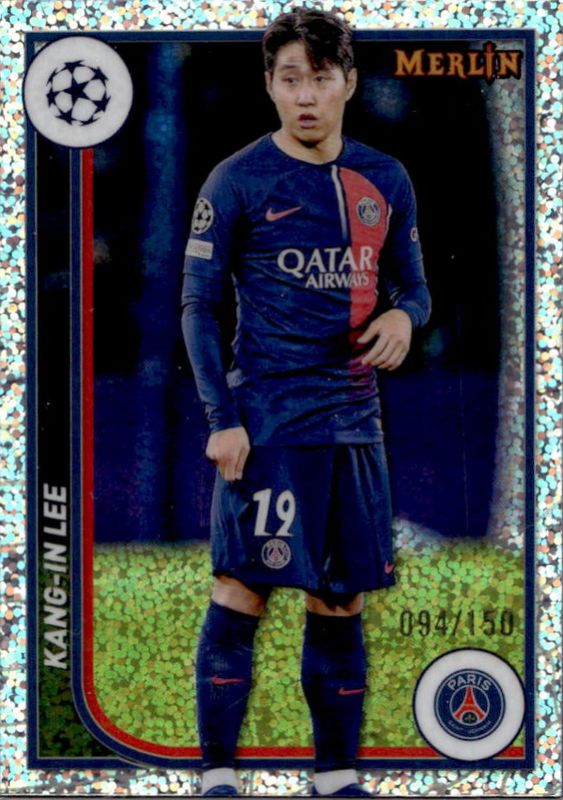 The Kang-In Lee 2023 Topps Merlin Chrome UEFA Club Competitions #90 Speckle Refractor /150 card is 1 of 25 Kang-In Lee's card variations in the 2023 Topps Merlin Chrome UEFA Club Competitions set being tracked by Sports Card Investor, including Base, Aqua Prism Refractor, Refractor, Vintage Merlin Refractor, and Neon Green Shimmer Refractor /399.