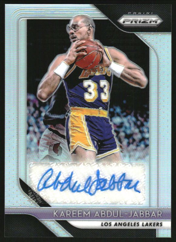 The Kareem Abdul-Jabbar 2018 Prizm #S-KAJ Signatures - Silver card is 1 of 50 Kareem Abdul-Jabbar's card variations in the 2018 Prizm set being tracked by Sports Card Investor, including Choice Blue Yellow Green, Fast Break, Red Ice, Red White Blue, and Silver.