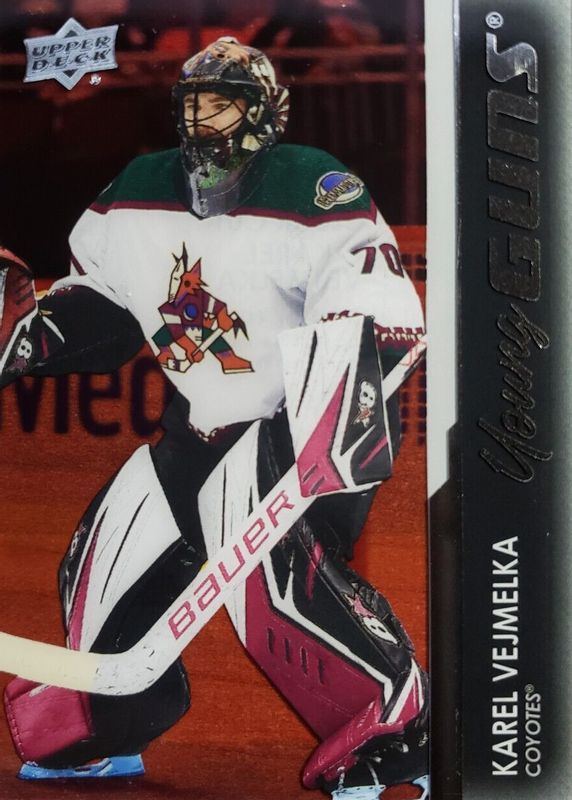 This card is 1 of 9 Karel Vejmelka's card variations in the 2021 Upper Deck set being tracked by Sports Card Investor, including Young Guns Base, Young Guns - Clear Cut Exclusives, Young Guns - French, Young Guns - Jumbo, and Young Guns - Silver Foil.