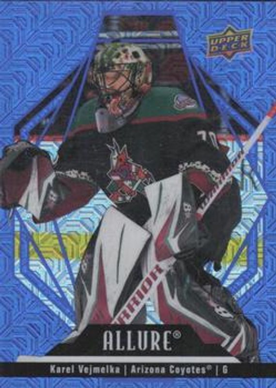 The Karel Vejmelka 2022 Upper Deck Allure #35 Blue Line /35 card is 1 of 27 Karel Vejmelka's card variations in the 2022 Upper Deck Allure set being tracked by Sports Card Investor, including Base, Black Rainbow, Glitter Bomb, Orange Slice, and Pink Leopard.