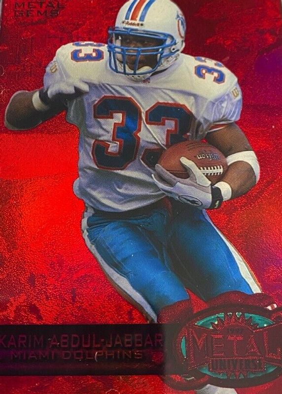 The Karim Abdul-Jabbar 1997 Metal Universe #93 Precious Metal Gems Red /135 card in Raw condition has not changed in price in the last 30 days and was last sold for $135.00 .