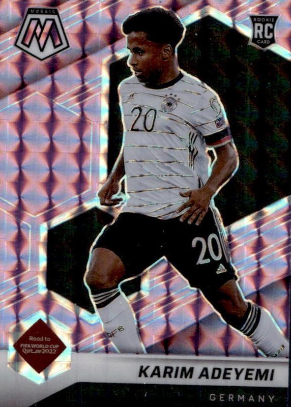The Karim Adeyemi 2021 Mosaic Road to FIFA World Cup #66 Purple /49 card in Raw condition has not changed in price in the last 30 days and was last sold for $7.50 .
