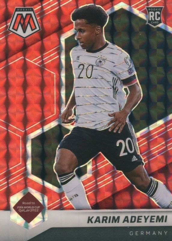 The Karim Adeyemi 2021 Mosaic Road to FIFA World Cup #66 Red card in Raw condition has not changed in price in the last 30 days and was last sold for $1.19 .