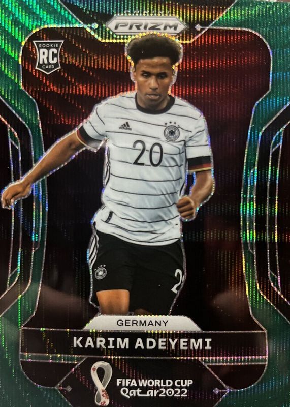 The Karim Adeyemi 2022 Prizm World Cup #111 Green Wave card in Raw condition has not changed in price in the last 30 days and was last sold for $2.63 .