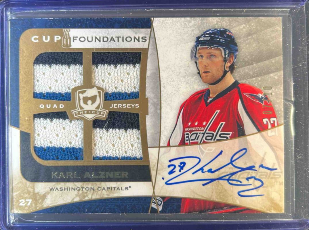 The Karl Alzner 2008 Upper Deck The Cup #CF-KA Foundations Jerseys Autographs /10 Rookie card is 1 of 37 Karl Alzner's card variations in the 2008 Upper Deck The Cup set being tracked by Sports Card Investor, including Base /249, Gold Rainbow /67, Gold /25, Black /1, and Auto Draft Boards.