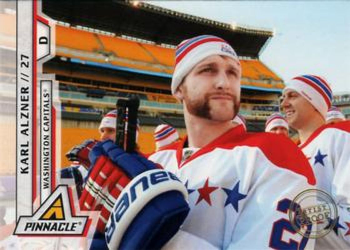 The Karl Alzner 2010 Pinnacle #4 Artists Proofs card is 1 of 9 Karl Alzner's card variations in the 2010 Pinnacle set being tracked by Sports Card Investor, including Base /299, Rink Collection, City Lights Materials /499, Threads /499, and City Lights Signatures /35.