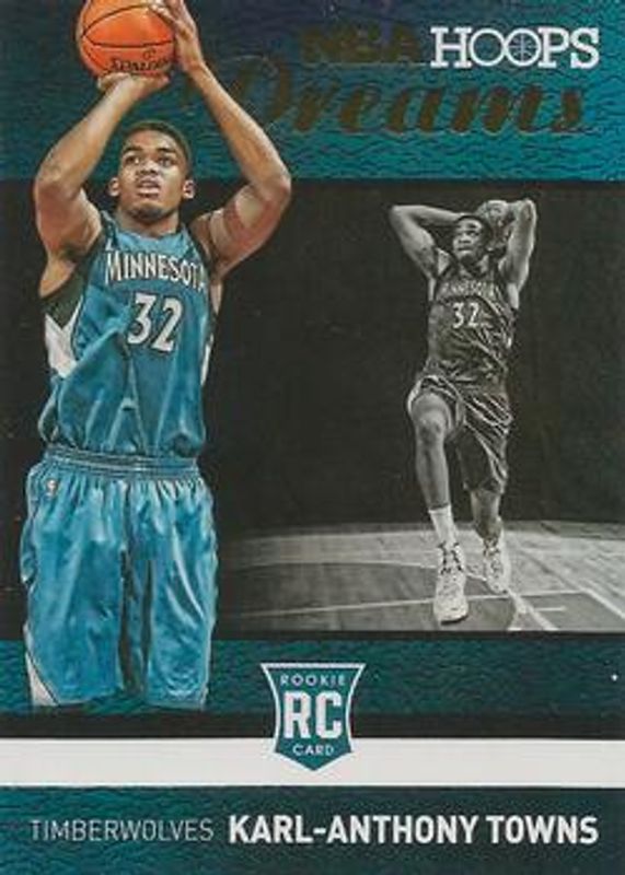 The Karl-Anthony Towns 2015 Hoops #6 Dreams Rookie card is 1 of 21 Karl-Anthony Towns' card variations in the 2015 Hoops set being tracked by Sports Card Investor, including #289 Base, Base, #289 Gold, #289 Green, and #289 Red Back.