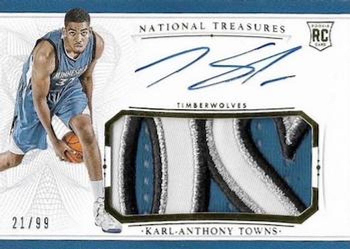 The Karl-Anthony Towns 2015 National Treasures #101 Base /99 Rookie card is 1 of 24 Karl-Anthony Towns' card variations in the 2015 National Treasures set being tracked by Sports Card Investor, including Rookie Patch Auto /99, Rookie Patch Auto - Silver /25, Rookie Patch Auto - Gold /10, Rookie Patch Auto - Emerald /5, and Rookie Patch Auto - Logoman /1.